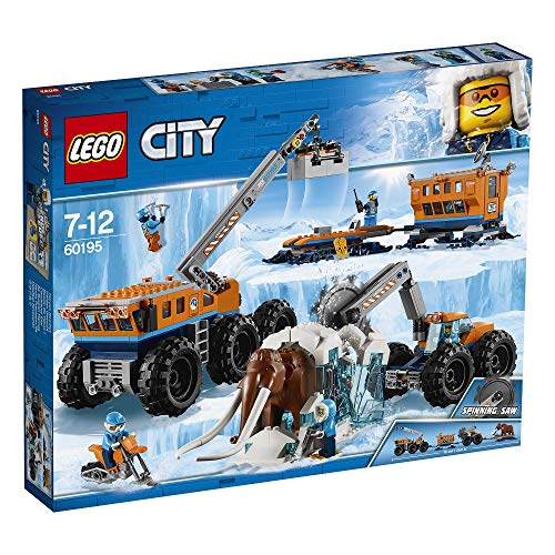 Investigate finds on the go with the LEGO City 60195 Arctic Mobile Exploration Base. This fun set features a crane with posable arm, hook, platform and a trailer, plus a mobile lab unit with radar dish and opening door. Also includes a mobile saw vehicle with posable arm and rotating blade, plus a snow bike and a large ice build to hold the mammoth. This arctic expedition set includes six LEGO explorer minifigures and a mammoth figure.