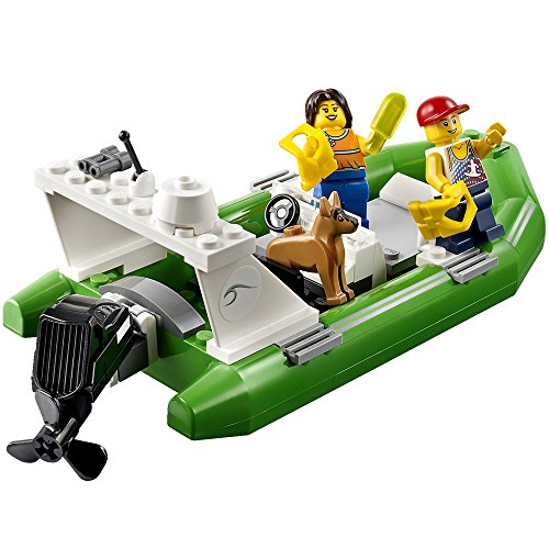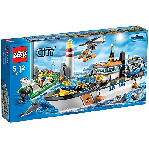 LEGO® City Coast Guard Coast Guard Patrol features 2 water cannons, submarine launcher and radio antenna, helicopter, submarine, dinghy, lighthouse with rocks and 3 sharks. Includes 6 minifigures with accessories. For 5 years and over.