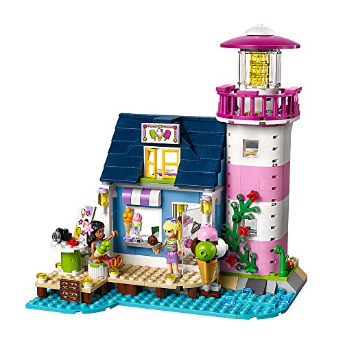 Enjoy a perfect afternoon by the sea at the iconic Heartlake Lighthouse! Stephanie is going to visit her friend Kate in the ice cream shop there. Help her pick an ice cream – there are so many flavors to choose from – and enjoy it on the pier in the sunshine. Head to the bathroom to freshen up and discover the ladder. Where does it lead to? Go exploring with Stephanie and find the secret room with a treasure map to start more adventures! Look out from the top of the lighthouse with the binoculars and spot the friendly seal sitting on a rock. Then climb into the row boat and head out to take pictures of it. After a day of fun with her friend, have a rest with Kate in the attic bedroom by lantern light. Which friends will come to visit for an ice cream tomorrow? Combine with the 41097 Heartlake Air Balloon for a sightseeing tour of Heartlake City. Includes 2 mini-doll figures: Kate and Stephanie, plus a seal