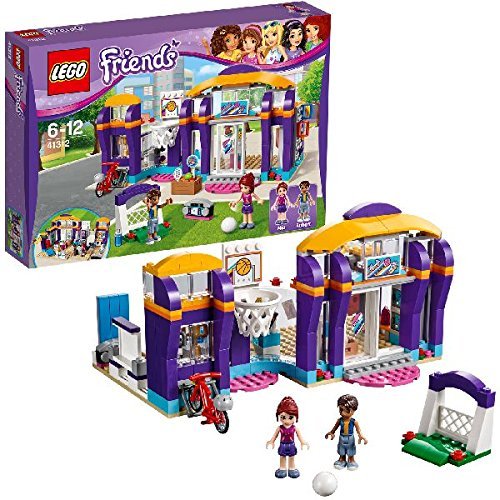 Get active at the LEGO® Friends Heartlake Sports Center. Inside the sliding entrance door there are lockers, a gym with a punch bag and gymnastic rings, juice bar, rolling treadmill and a yoga studio with an exercise bar, weights and a yoga mat. Outside there’s a bike rack, soccer goal and basketball game with shooting function. Includes two mini-doll figures.