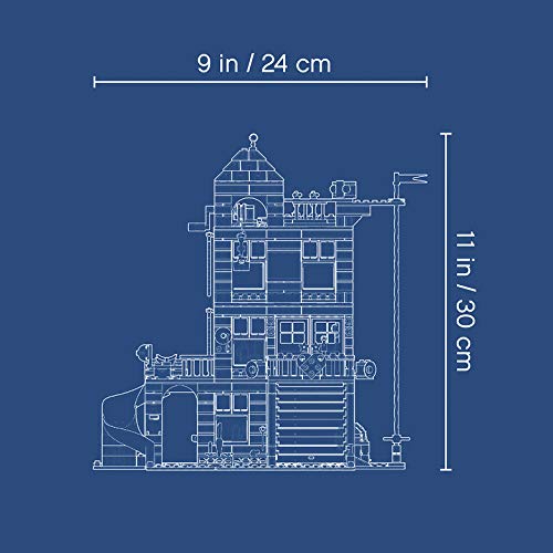 - Set featuring a 4-story converted fire station building with a garage, kitchen, bedroom, roof terrace, performance terrace, pulley system, slide and a friendship tree