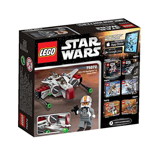 Defend the Republic above Coruscant with the advanced LEGO Star Wars ARC-170 Starfighter microfighter. This great mini-scale version of the Republics rugged starfighter features an amazing amount of detail, including folding wings, 2 flick missiles and a mini cockpit for the Clone Pilot to sit in! Fire up the engines and get ready to track down the Separatists! Includes a Clone Pilot minifigure with a blaster pistol.